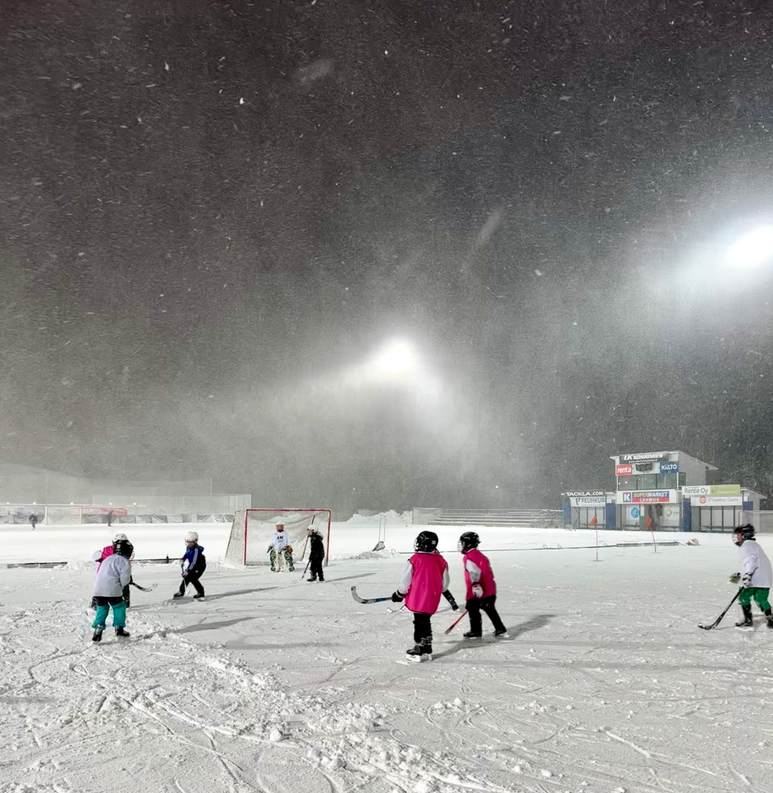 Lumimyrsky riepottelee Suomea, mutta meidän sinnikkäät U10-junnut eivät pienestä hätkähdä. Tuulta ja tuiverrusta uhmaten kentällinen pieniä luistelijoita sai kauden ensimmäiset luistimen potkunsa isolla jäällä.