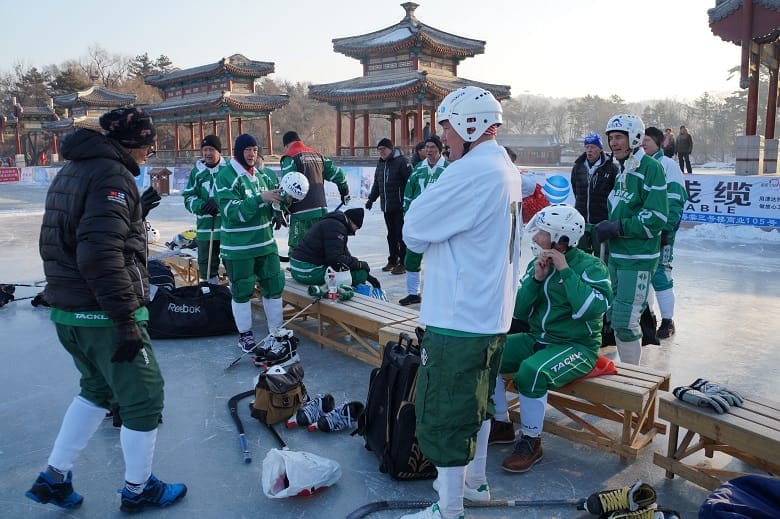 Veteraanit valmiina! Chengden keisarillisen kesäpuiston jääkenttä on vedetty tekolammen jäälle. Pukukopin virkaa hoitaa vaihtopenkki. Tämä on tietysti veteraanipelaajille tuttua 50-, 60-, 70- ja 80-luvuilta… Hieno ja eksoottinen paikka pelata jääpalloa! (Kuva: M. Haikala)